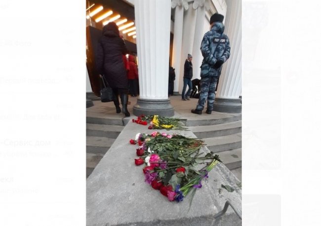 09:40 У колонного крыльца театра все больше цветов, их оставляют тут же, на ступенях. Внутрь заносят венки, очень много. От разных столичных театров.