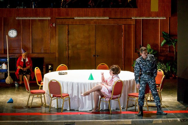 Его несчастье — жена Наташа, то и дело совершающая проход, как по подиуму, в белой шубе, на каблуках. «Я к вам в домашнем», — поет выдвинутая на соискание «Золотой маски» Ольга Тенякова, вызывая смех зала. Пожалуй, это самая неожиданная Наташа из тех, кого только приходилось видеть, а теперь и слышать. Ее появление сопровождают дребезжащие звуки, напоминающие полет осы, и клубы дыма.