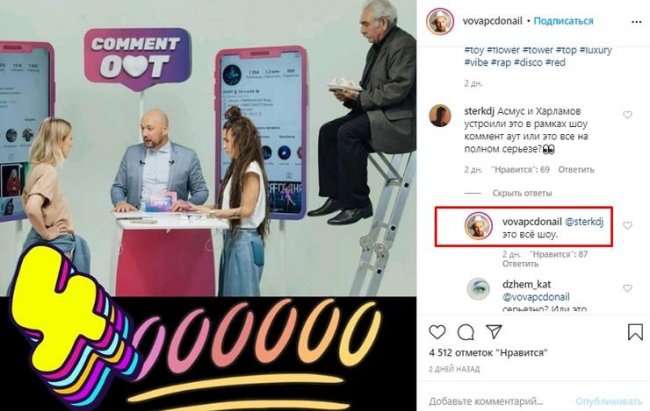 В комментариях под одним из свежих постов на личной странице «Инстаграма» звезды шоу Comment Out Владимира Маркони появился вопрос: развод Гарика Харламова и Кристины Асмус — это очередной розыгрыш в рамках проекта или все на полном серьезе. «Это все шоу» (здесь и далее орфография и пунктуация авторов сохранены, — прим. ), — лаконично написал в ответ Маркони.