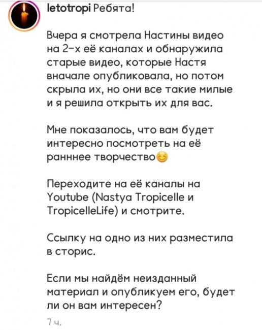 Родители открыли доступ всем пользователям YouTube к каналу Насти, где появились новые ролики. Ранее фрагменты были доступы только участникам платного марафона. Теперь поклонники Тропицель могут взглянуть на зарядку девушки, узнать, откуда берется лень, а также воспользоваться методиками для повышения продуктивности.