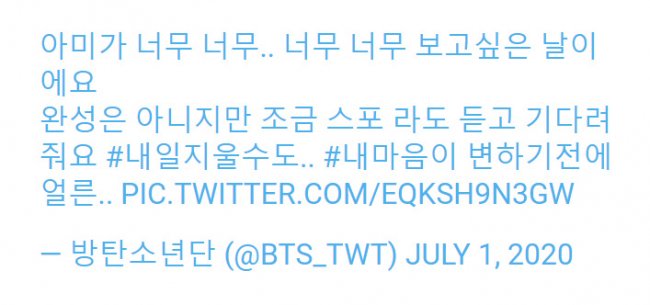 В своем аккаунт Twitter Тэхён уже опубликовал очень трогательное сообщение для АРМИ, где признался, что очень по ним скучает. А также, айдиол заверил публику, что сейчас очень занят работой над некоторыми песнями, которые, возможно, и являются композициями нового альбома.