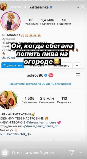 Аня Покров не стала вступать в конфликт и загрузила в сторис: «Ой, когда сбегала попить пива на огороде»