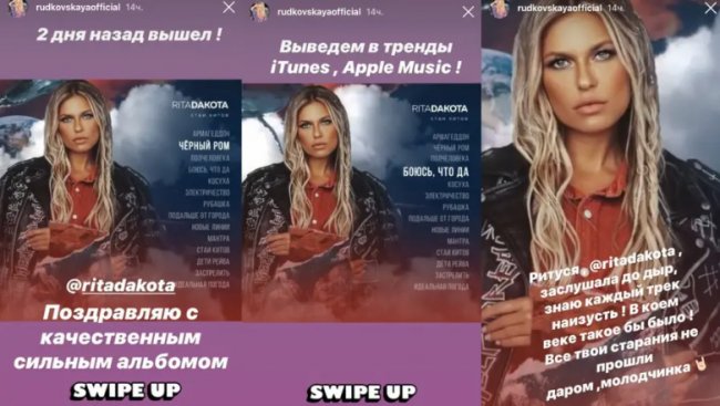 На следующий день в stories Яны Рудковской появились ссылки на новый альбом Риты, восхищенные комментарии и призывы скачать и послушать треки сингера. Разумеется, подписчики не смогли поверить в искренность телеведущей.