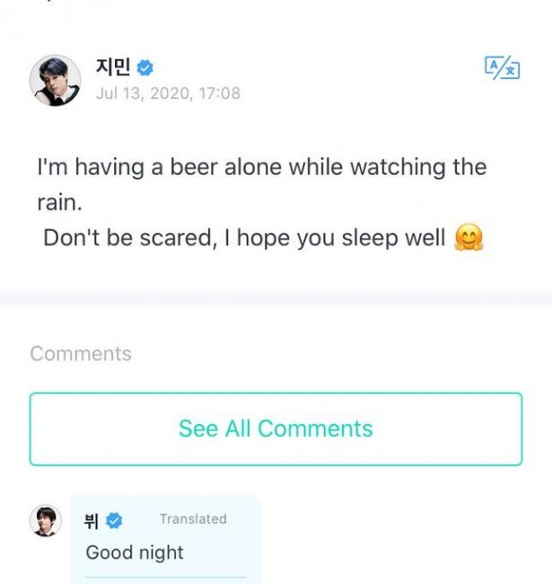 А сразу после этого на Weverse появилось сообщение от Тэхёна, который зашел туда специально, чтобы пожелать спокойной ночи своему другу.