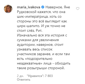 «Рит, ну этот ХЛАМУР из 90-х реально не достоин вашего внимания! Этот бренд верх пошлости благодаря этой бабе Яне стал. Плюньте и забудьте! Вам не нужны их извинения, они застряли в прошлом, а вы идёте дальше «,