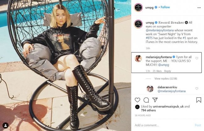 Американская EDM и поп певица Мелани Фонтана ( Melanie Fontana) поймала волну хейта от защитников творчества BTS. Причиной конфликта стало написание песни «Sweet Night», которое было разделено между Мелани и Мишель «Линдрен» Шульц (Michel “Lindgren” Schulz).