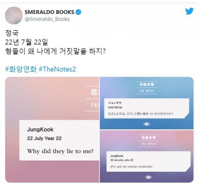 22 июля в Smeraldo Books начали публиковать новые записи The Notes 2, которые рассказывают о вымышленной истории, созданной для каждого участника BTS, как и сообщается в клипах группы, The Notes 1 и в вебтуне Save Me. Самая последняя заметка была опубликована Чонгуком (Jungkook).