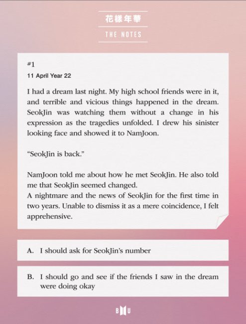 Итак, в записи говорится о таинственном сне, в котором происходили ужасающие вещи со школьными друзьями автора записки. Чуть позже он увидел холодно смотрящего на весь этот леденящий ужас Джина (Jin) и решил рассказать о происходящем Намджуну (Namjoon).