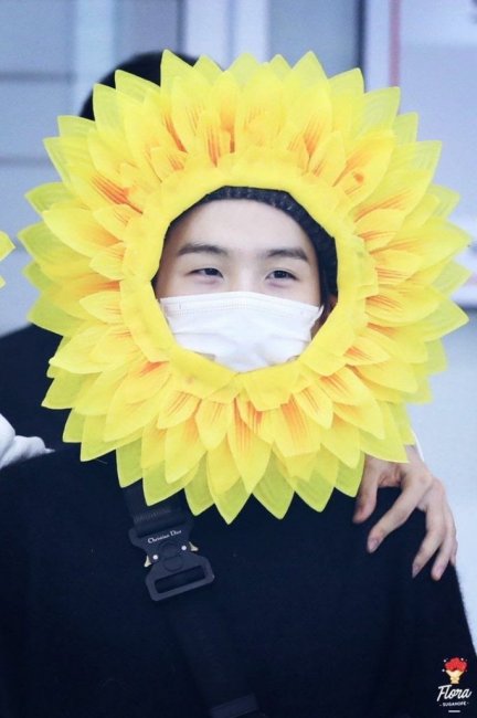 Начнем с самого жаркого костюма. Знакомьтесь, этого парня зовут Шуга (Suga) и он нарядился подсолнухом без объяснений.