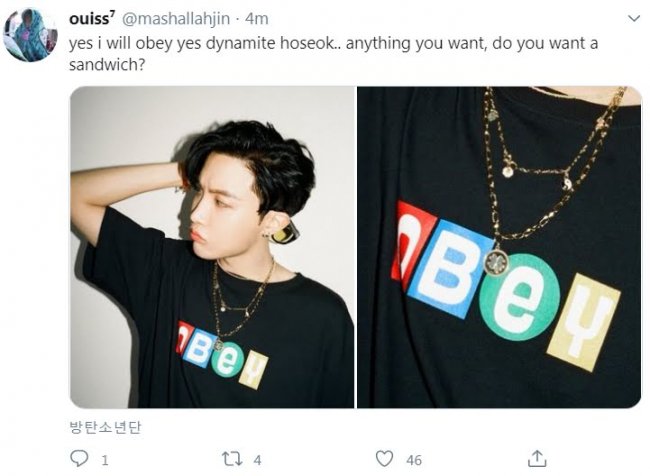 Фотография музыканта вызвала небывалый ажиотаж среди поклонников бойз-бэнда. И, конечно, АРМИ не могли не обратить внимания на надпись «OBEY» («Подчиняйся») на футболке айдола.