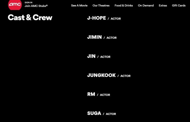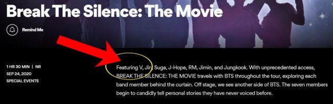 Фанаты бойз-бэнда решили взглянуть на описание фильма на страничке одного из кинотеатров сети AMC Theatres и обнаружили, что имя Ви (V) не значится ни в разделе «Съемочная группа», ни среди актеров.