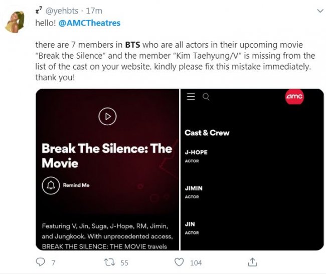 Seriously? How do you f*ck this up? BTS is 7 members. SEVEN. My four year old niece knows how to count to seven.@AMCHelps @AMCTheatres Please address V/Kim Taehyung's absence from the cast listing for Break the Silence. pic.twitter.com/5ZXq1LsMoA