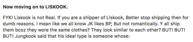 «Лисгук (Liskook) – это фейк. Все прекрасно знают, что Чонгук любит участниц BP, но не в романтическом смысле. Вы шипперите их только потому, что они носят похожую одежду!? Что за бред!?»