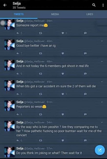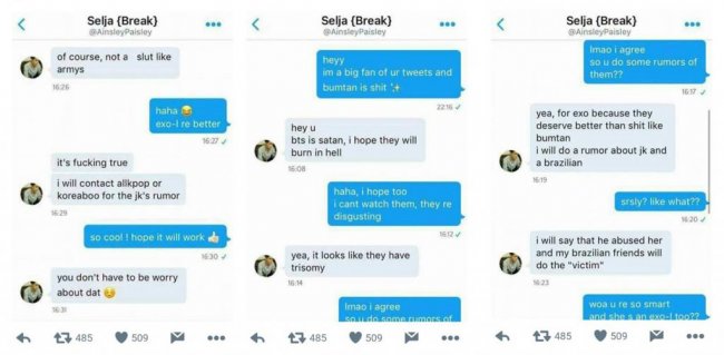 Угрозы шли со многих аккаунтов, имена которых она постоянно меняла. Через некоторое время АРМИ удалось вычислить ,что все эти аккаунты принадлежат ей одной. Одним из самых узнаваемых акков был @AinsleyPaisley, который позднее был переименован в @Selja_Helllover.