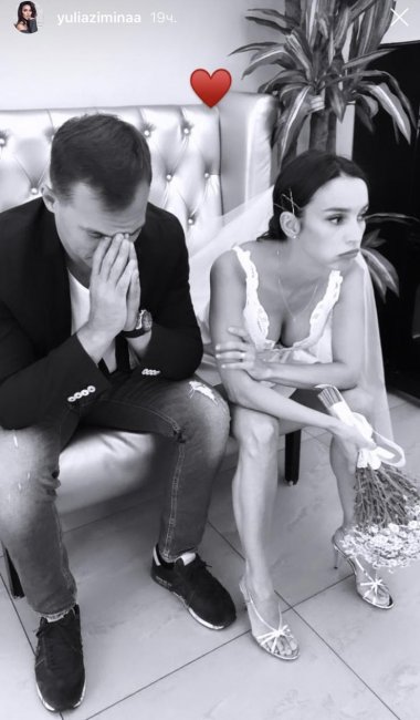 «Атас! Ребята, я вышла замуж! Он самый лучший на свете», — написала Зимина, опубликовав фото из ЗАГСа, на котором сидит вместе с избранником на диванчике в ожидании росписи. А позже в микроблоге Юлии появился кадр поцелуя с мужчиной, имя которого 39-летняя актриса предпочла не называть. Любопытно, что вместо традиционного платья невесты Зимина предпочла короткий белый комбинезон. А жених заменил рубашку на футболку.