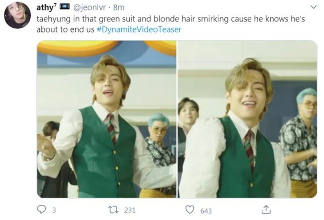 it’s been 20 minutes and im still thinking of kim taehyung in the green outfit with the hair slicked back #DynamiteVideoTeaser pic.twitter.com/o0MeOhNpDT