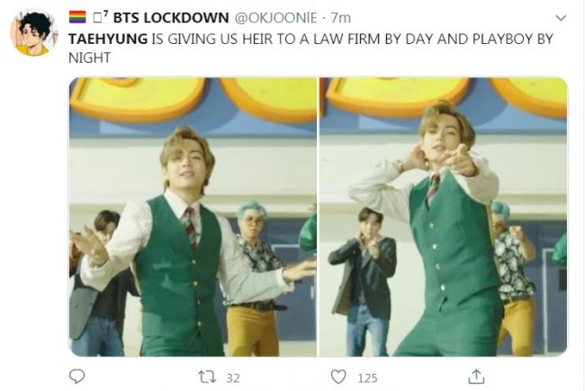 В предрелизном ролике все музыканты одеты в яркие ретро-костюмы, но зеленый костюм Тэхёна сразил фанатов группы наповал.