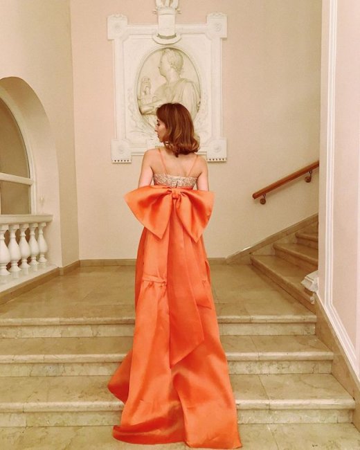 Старшая дочь Валерия Меладзе, 28-летняя Инга приехала на бал в необычном атласном платье кораллового цвета бренда Maya Om. На спине наряд девушки украшал большой бант в тон платью.
