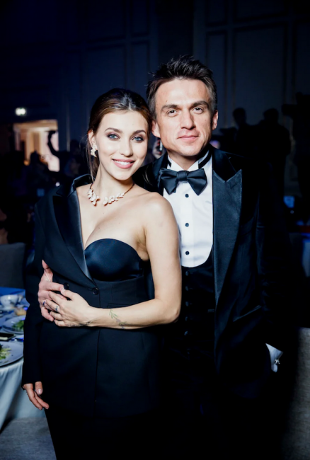 Влад Топалов и Регина Тодоренко решили создать парный лук. Телеведущая выбрала черный смокинг необычного кроя с отрытым плечом и линией декольте. А Влад сопровождал супругу в черном классическом смокинге, с белой рубашкой и черной бабочкой.
