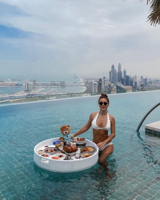 В этот раз Ани похвасталась тонкой талией и стальным прессом в белоснежном купальнике. Она устроила себе отдых в одном из роскошных отелей в Дубае. Певица позировала в бассейне рядом с «плавающим» завтраком, а на фоне открывался живописный вид на город и Персидский залив.