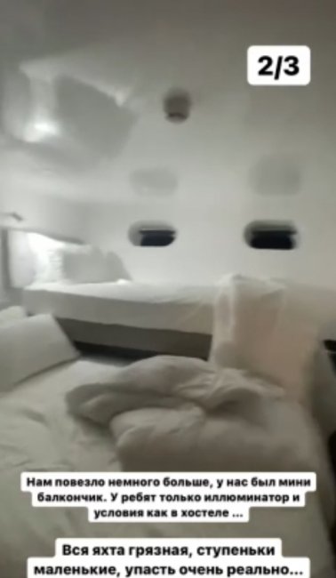 Девушка отметила, что отдых с Тимати — удовольствие не из дешевых. Например, каждая каюта стоит от 8 600 до 10 600 долларов. За эти деньги люди не могут даже зарядить телефон, смыть воду в унитазе, включить кондиционер и нормально покушать. Девушка намерена ждать переселения. Если этого не случится она будет требовать от организаторов возврат средств.