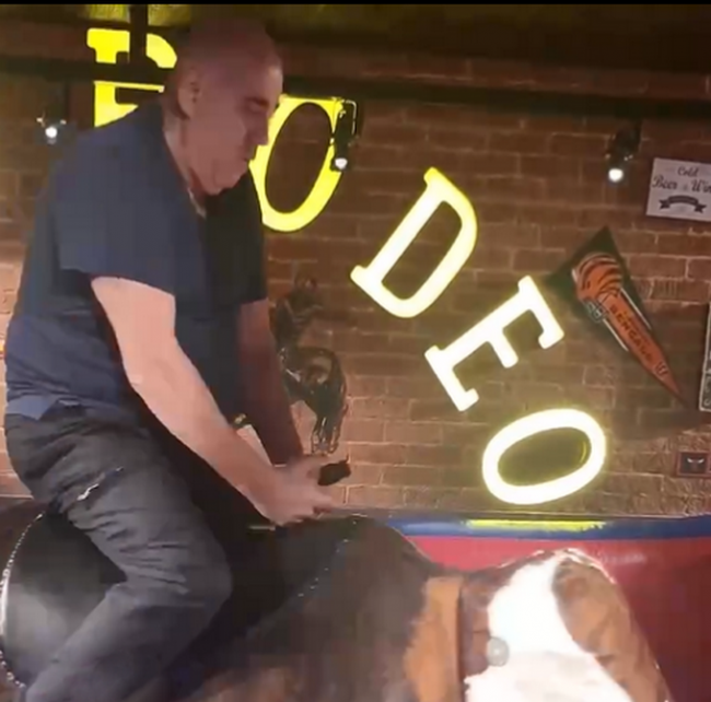 В ролике, который был выложен в соцсети, Иосиф Пригожин оседлал движущийся муляж быка, который раскачивался и вращался, а продюсер и муж певицы Валерии изо всех сил пытался удержаться на нем, что ему с трудом, но удавалось.