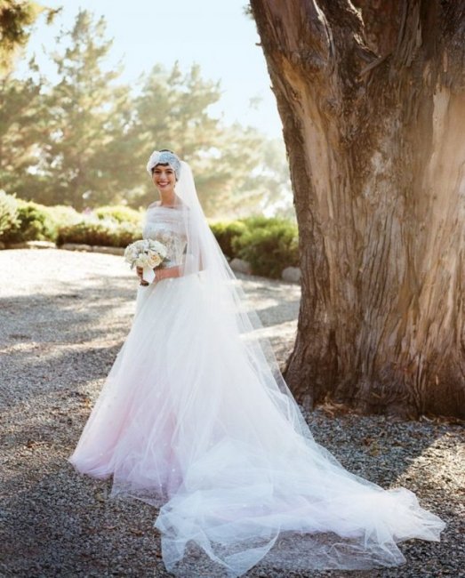 Звезда фильмов «Дьявол носит «Prada» и «8 подруг Оушена» предстала в 2012 году на свадьбе с давним возлюбленным Адамом Шульманом в женственном платье, которое заслуженно занимает 1-ю строчку нашего рейтинга. Для торжественной церемонии Хэтэуэй выбрала невесомый наряд, похожий на облако, от бренда Valentino. Подол был окрашен в нежно-розовый цвет. Кутюрье Валентино Гаравани тогда уже ушел на пенсию, но вернулся к дизайну один раз ради завершения платья Энн. И точно не зря, ведь воздушный образ актрисы получился невероятно красивым.