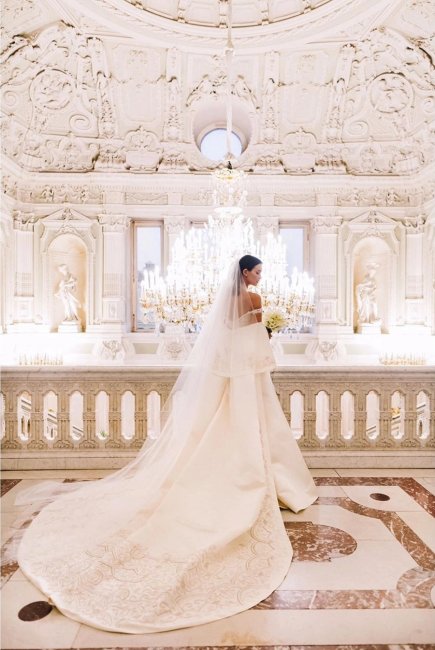 Одна из самых известных мировых пар, Ким Кардашьян и Канье Уэст, связали себя узами брака в 2014 году во Франции. Звезды подали на развод в 2021 году, но свадебный образ Ким до сих пор поражает своей красотой. Шикарное платье для нее создал звездный модельер Риккардо Тиши. Наряд от Givenchy для звезды реалити-шоу «Семейство Кардашьян» оценивают в полмиллиона долларов. Одно из самых дорогих свадебных платьев среди селебрити идеально подчеркнуло фигуру модели в знаменательный для нее день. Ким словно превратилась в сицилийскую невесту в облегающем кружевном платье, а пикантности ее образу добавили прозрачные вырезы на талии.