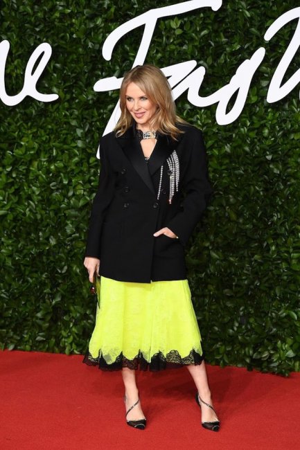 В отличие от яркой Ри-ри, Кайли Миноуг появилась на церемонии в строгом наряде. Певица надела черный жакет и юбку неонового цвета, подол которой был украшен черным кружевом.
