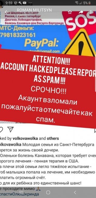 Впрочем на этом обман не закончился. Хакеры в инстаграме опубликовали от имени звезды обращение с просьбой о финансовой помощи якобы больному ребенку. «Молодая семья из Санкт-Петербурга борется за жизнь своей дочери. У Оленьки болезнь Канавана, которая требует очень дорогого лечения — генная терапия в США. На плечи этой семьи легло тяжёлое испытание — чтоб малышка попала на лечение, им необходимо оплатить огромный счёт. Но для их ребёнка это единственный шанс! Не проходите мимо», — появилось сообщение на странице звезды. А вскоре и вовсе злоумышленник вышел на связь с Екатериной и даже начал… вымогать у нее денег.