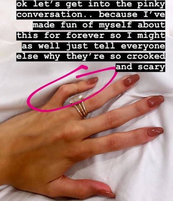 Хейли опубликовала в сторис фотографию левой руки, на которой видно, что она не может выпрямить мизинец. Девушка написала в комментарии, что решила расставить точки над «i» и прекратить распространение небылиц о ее руках.