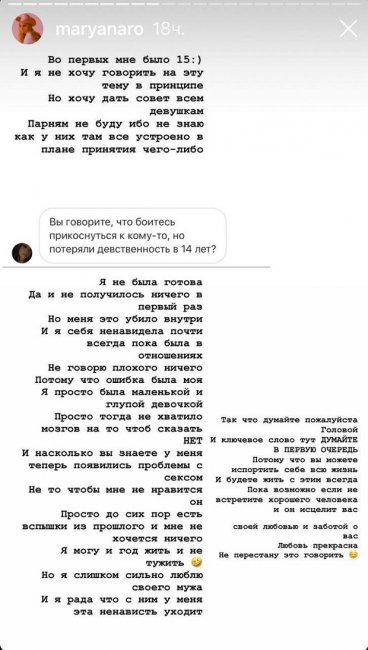 Недавно Марьяна Ро решила откровенно ответить на некоторые вопросы подписчиков в сторис. Марьяна поблагодарила поклонников за поддержку и удивилась критике хейтеров. Одна из подписчиц упрекнула певицу в том, что та потеряла девственность в 14 лет, при этом не терпит прикосновений и близости.