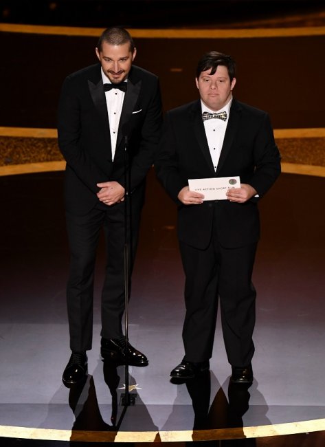 Зак Готтзаген, актер с синдромом Дауна, вышел на сцену со своим партнером по фильму «Арахисовый сокол» Шайя Лабафом, чтобы объявить лучшую короткометражку 2019 года — «Окно напротив».