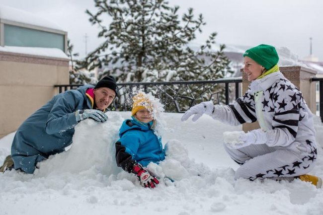 Семья уже два раза побывала на горнолыжном склоне, Марьяна решилась встать на лыжи только со второго раза, а в первый визит прекрасно провела время со своим сыном Гришей.