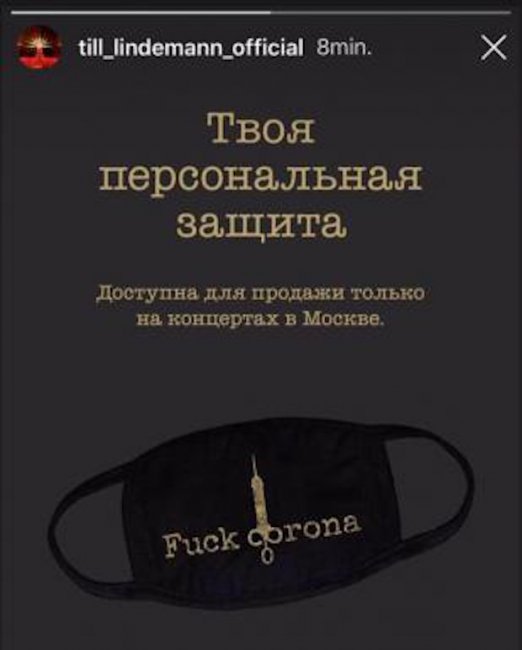 Кроме того, во время концерта поклонники могли купить мерч группы. Специально для Москвы Тилль изготовил черные медицинские маски с надписью F*ck corona и шприцом между букв.
