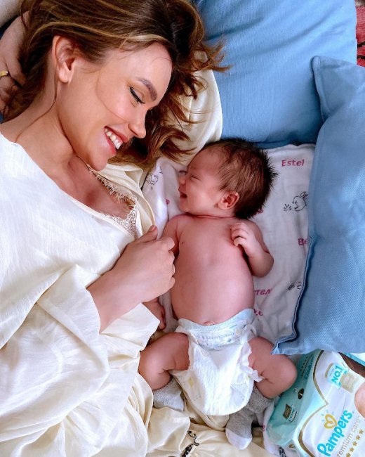 «На кого похожа малышка? Не знаю, участвовал ли Санёк, но мне кажется, что губы, носик и профиль — всё моё! Но вот поднимает брови и спит, закинув ручки, точно, как папа, но для Саши этого мало, поэтому напишите, что Эстель вылитая отец-молодец!»