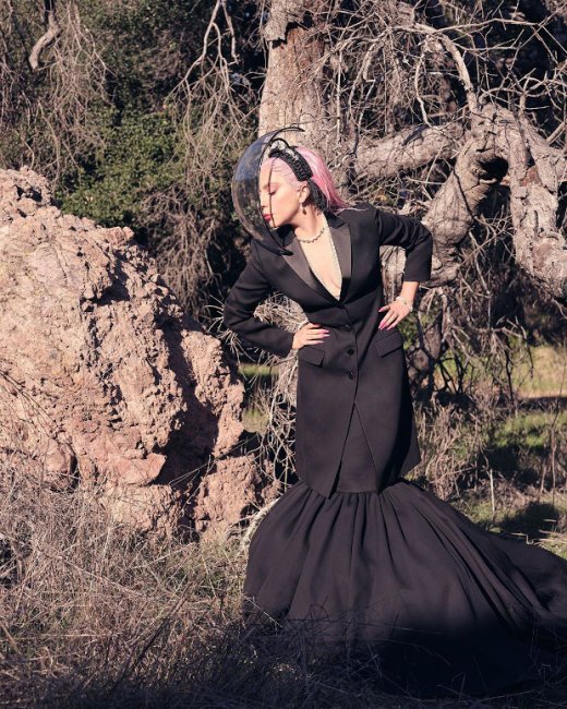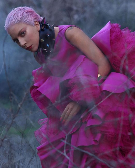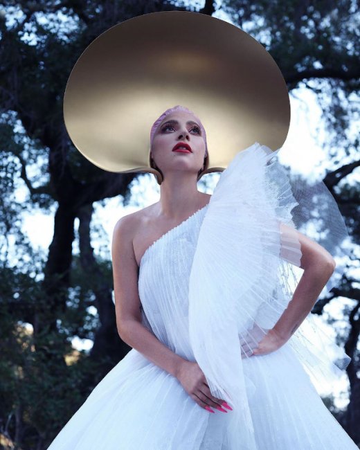В последнее время Гага выбирает розовые тона, и в этот раз примерила два ярких платья с пышным подолом из фатина, белоснежный наряд на одно плечо с огромным золотым кокошником, а также удлиненный черный пиджак с объемной юбкой. Дополнить нуарный образ артистка решила пластиковой вуалью, больше напоминающую маску.