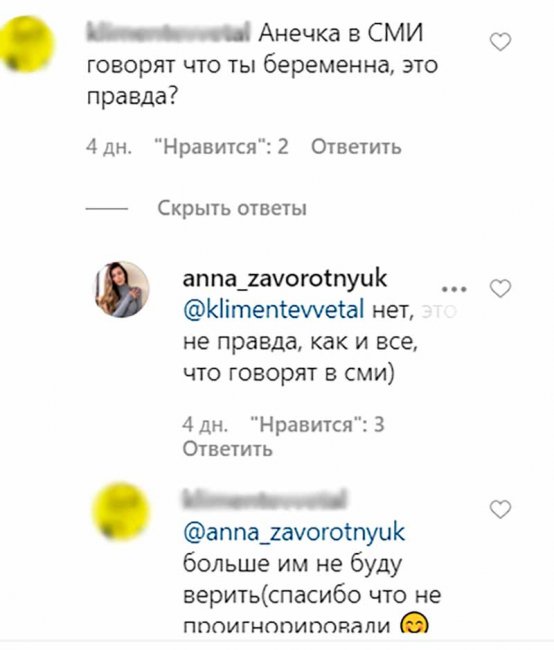 До недавнего времени семья и близкие родственники вообще отказывались давать какие-либо комментарии о жизни актрисы и их семьи. По всей видимости натиск, вопросов оказался слишком велик. Несколько дней назад Анна Заворотнюк ответила одной из своих подписчиц в Инстаграме на вопрос о своей беременности. Поклонница спросила ее, правда ли, что девушка находится в интересном положении?