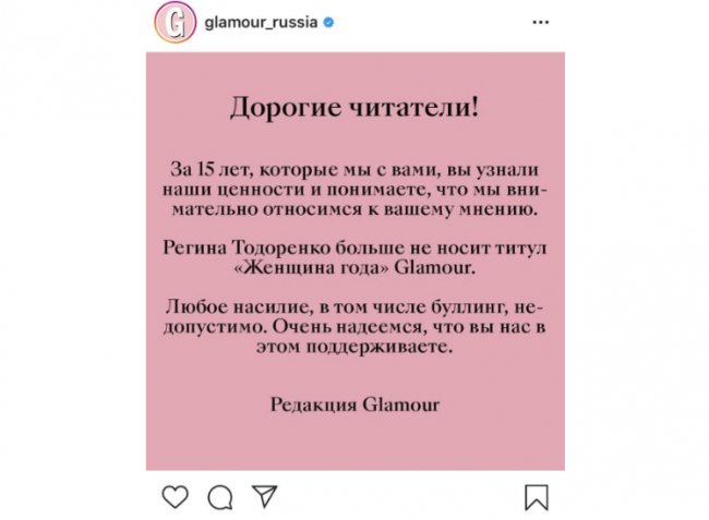 На ситуацию быстро отреагировал Glamour Russia. Журнал лишил Регину Тодоренкопремии «Женщина года» по версии Glamour. Премия считается одной из самых ярких и влиятельных церемоний в России.