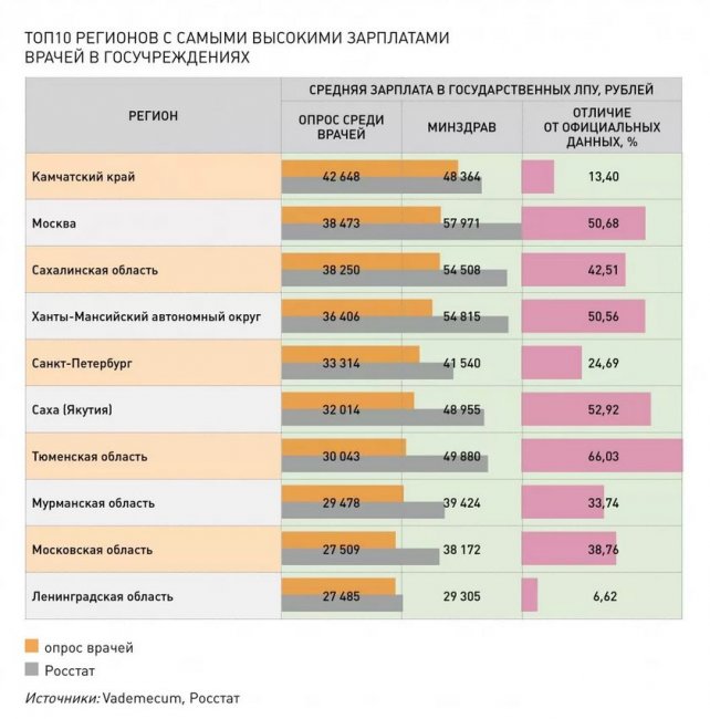 В Москве и Санкт-Петербурге средняя зарплата — 38 тысяч рублей. А средний доход по России составляет 24,448 тысячи рублей, что почти в два раза меньше заявленной Минздравом цифры.