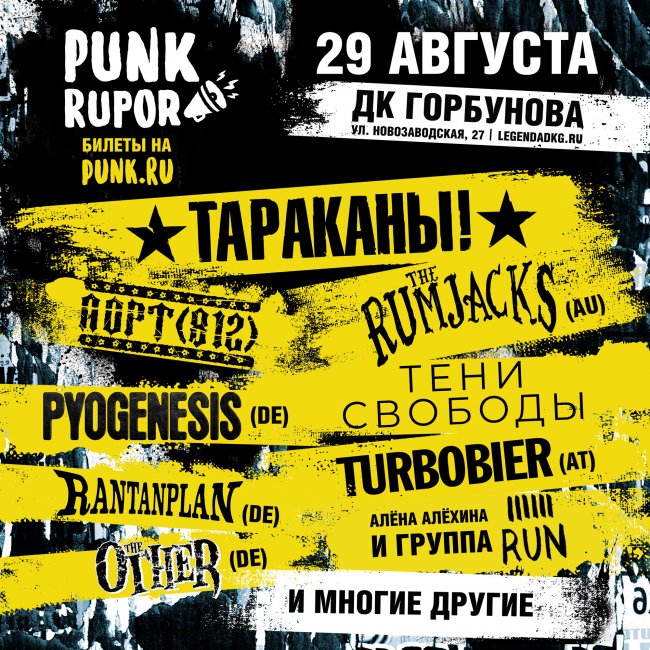 29 августа, в последние выходные лета, на сцену фестиваля PunkRupor поднимутся музыканты со всего мира: «Тараканы!», The Rumjacks (Австралия), Turbobier (Австрия), Rantanplan (Германия), Порт (812), «Тени Свободы», The Other (Германия), 321RUN, Pyogenesis (Германия) и многие другие!