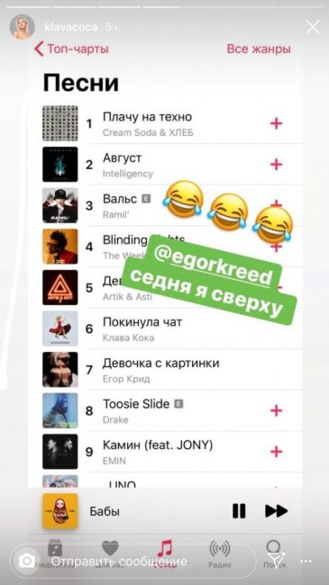 В недавнем времени у обоих артистов вышли новые треки и сейчас они борются за верхние позиции музыкальных чартов. Вчера Клава Кока решила пошутить и выложила историю в Инстаграм, где упомянула Егора Крида, со словами: «Сегодня я сверху». Поклонники не смогли не отреагировать на такую провокационную фразу девушки. Разговоры об их отношениях и так не прекращаются ни на минуту, а после таких фраз они ещё больше разрастутся. Так, фанаты артистов стали писать, что любимая поза ребят, когда Клава сверху.
