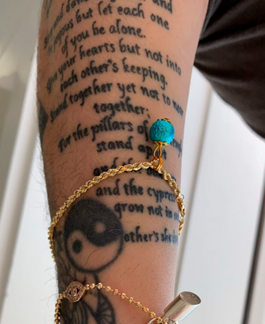 «Пойте и танцуйте вместе, и будьте счастливы, но пусть каждый из вас будет один. Отдайте свои сердца, но не друг другу. Стойте вместе, но не слишком близко друг к другу, ибо колонны храма стоят порознь, а дуб и кипарис растут не в тени друг друга»