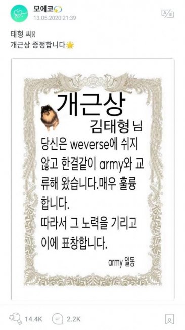 По мнению поклонников бойбенда BTS Тэхен (Taehyung) заслуживает отдельной награды. В недавнем времени один из АРМИ отправил айдолу грамоту, которую сделал самолично. На такое сообщение кумир не мог не ответить.
