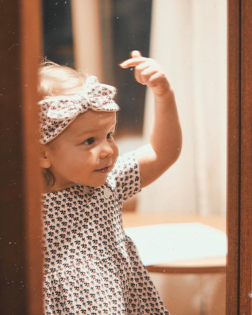 Симбе явно понравился ее романтический total look. Девочка с интересом рассматривала наряд в зеркале и мило улыбалась в объектив фотографу. Домашняя фотосессия пришлась по вкусу и близким Нюши.