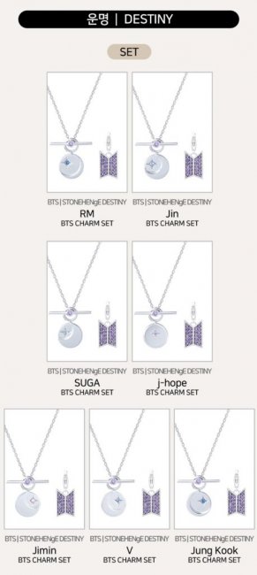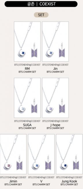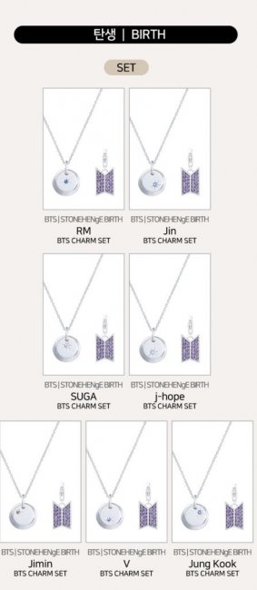 К-поп группа BTS совместно с STONEHENgE разработали свою линию украшений. Коллекция называется «Moment of Light» и состоит из 3-х разных концептов: BIRTH, DESTINY иCOEXIST. В каждом блоке разработан свой дизайн подвесок на каждого мембера, которые будут представлены в 21-ой вариации.