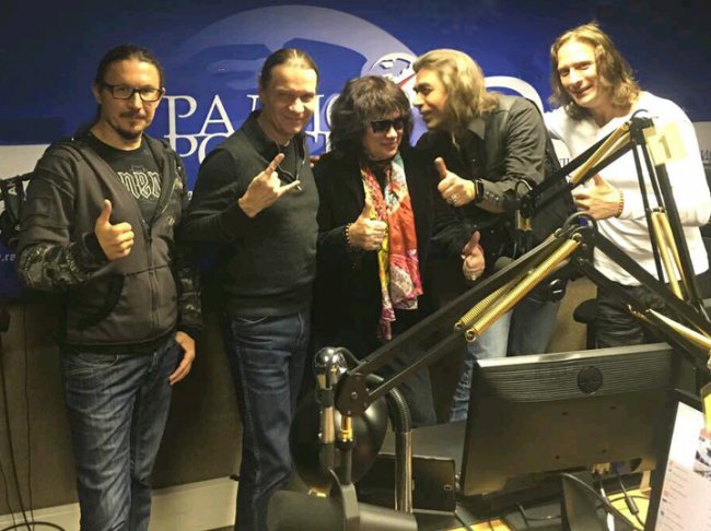 Маргарита Пушкина, Валерий Кипелов, гитарист Вячеслав Молчанов, бас-гитарист Алексей Харьков и радиоведущий Дмитрий Добрынин