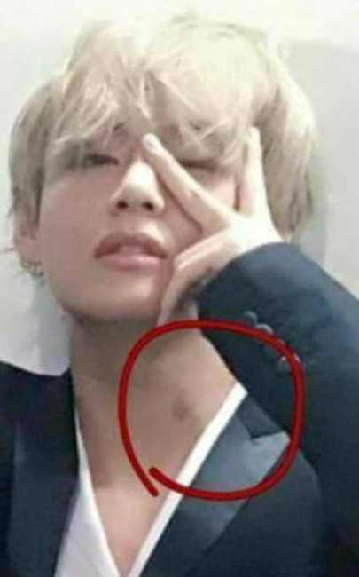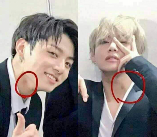 Мы сделали подборку самых «вкусных» засосов Тэхёна и пришли к выводу, что у Ви, шея является самой эрогенной зоной. Обратите внимание, синяки всё время одной формы, а это значит у айдола постоянный партнер, который слишком страстно его целуют, просто немного перебарщивая с поцелуями.