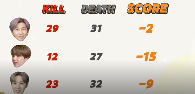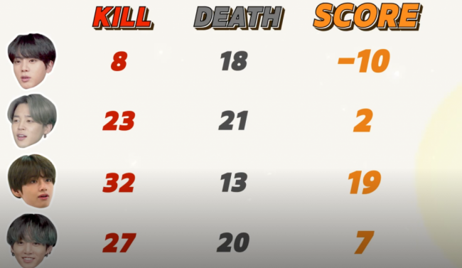 А вот максимальное число провалов на поле боя у Джина (Jin) всего восемь поражения и аж 18 смертей. Как так? Скоро в армию идти, а не какой военной подготовки. Больше остальных грохнули самого энергичного стрелка Чон Хосока (J Hope) аж 32 раза, один только Тэхён замочил его 12 раз. Потому что надо было меньше носиться по полю.