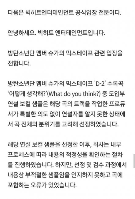 Конфликт дошел и до Big Hit, которые признались, что использовали образец без каких-либо конкретных намерений и не знали, что это было неуместно.